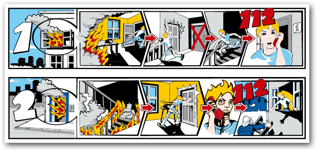 Um ähnlichen Katastrophen vorzubeugen, haben wir in Zusammenarbeit mit dem Senat von Berlin und der Berliner Feuerwehr diesen nonverbalen Comic entwickelt, der sprachenunabhängig die zwei grundlegenden Verhaltensweisen im Brandfall – erstens bei Feuer in der Wohnung, zweitens bei Feuer im Treppenhaus – erläutert. Diesen Comic, den es auch als Videoclip gibt, setzen inzwischen immer mehr Feuerwehren, Wohnungsbaugesellschaften und Versicherer im gesamten Bundesgebiet für ihre Kundenkommunikation und Brandschutzausbildung ein.